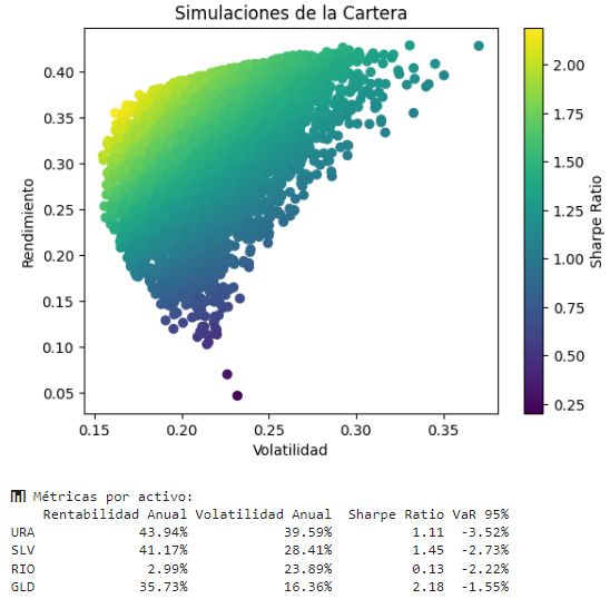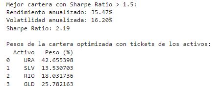 Esto que significa? Que aplicando Montecarlo para simular carteras ganadoras, los porcentajes que me arroja el calculo me “garantizan” un RENDIMIENTO mayor que si hubiera dividio el capital en partes iguales entre los (4) activos seleccionados